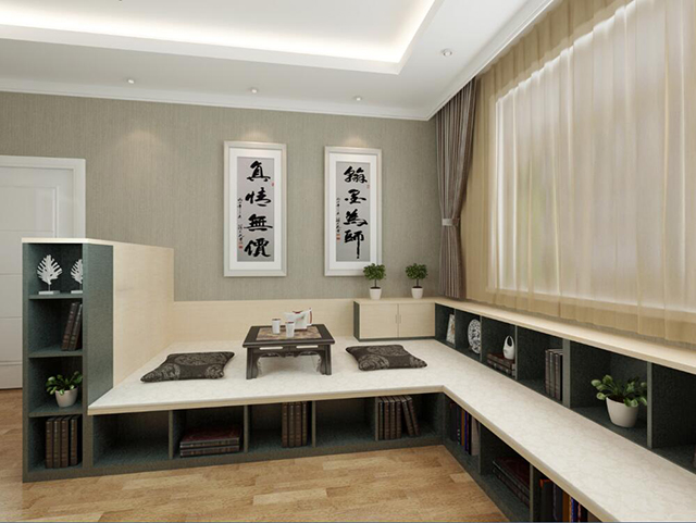 如果你家的飄窗面積足夠大。采光、通風(fēng)、視野都很好,那你可以把飄窗設(shè)計成一個多功能的休閑區(qū)。這樣的飄窗相對來說比較普遍,客人來了可以坐在著喝喝茶聊聊天,視野寬闊,生活雅致而又韻味。