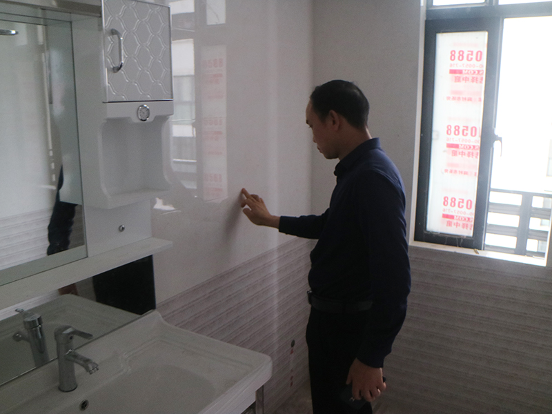 吳總在認(rèn)真的檢驗(yàn)瓷磚鋪貼施工工藝