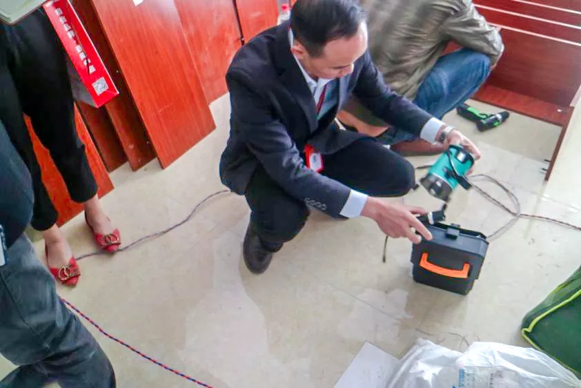 吳總使用水平儀檢測(cè)砌墻陽(yáng)角處垂直度。