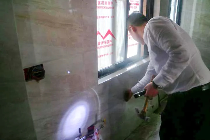 丁總細(xì)心的檢驗(yàn)鋪磚工藝,親自砸掉沒(méi)有按標(biāo)準(zhǔn)施工的瓷磚,責(zé)令整改。