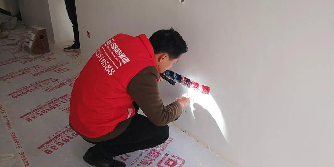 集團(tuán)工程質(zhì)量管理中心總監(jiān)吳總用強(qiáng)光手電筒檢查刮膩?zhàn)悠秸?/span>