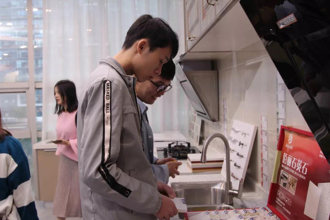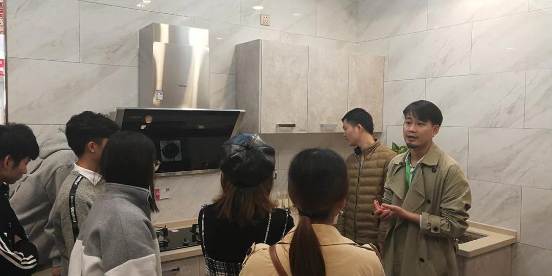在廚房展示區(qū),設(shè)計部經(jīng)理韋昌豪和學(xué)生分享:“如果同學(xué)們今后決心要成為一名設(shè)計師,現(xiàn)在開始就要關(guān)注一些基礎(chǔ)的設(shè)計上的問題,對廚房的配置多做基礎(chǔ)的了解,平時也可以自己拿尺子量一些門、窗的尺寸。設(shè)計源于生活,設(shè)計師做出的設(shè)計也要根據(jù)現(xiàn)實(shí)生活來落地?!?