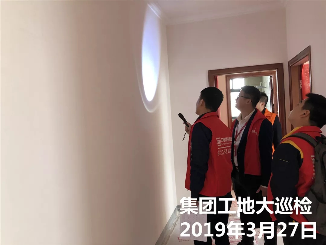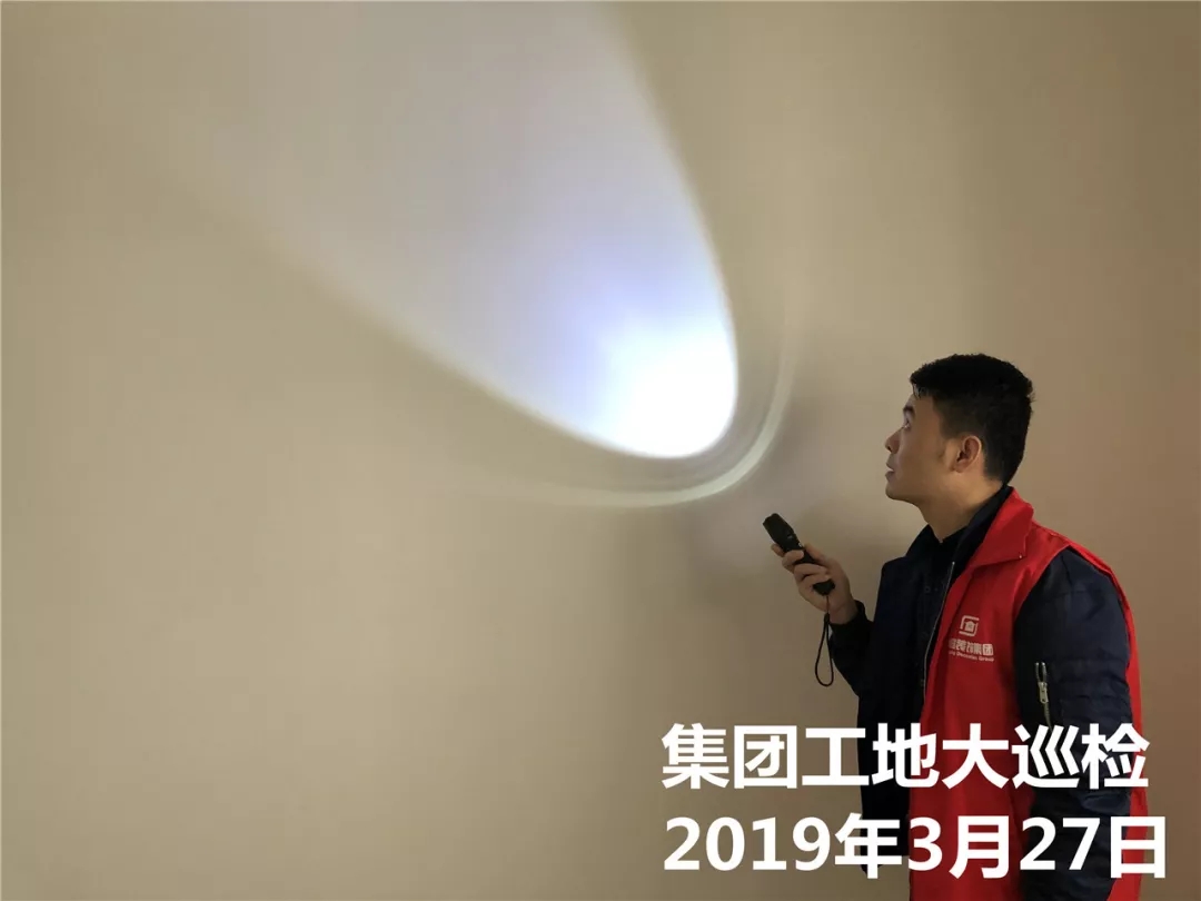 運(yùn)營部成云總經(jīng)理與張立安總經(jīng)理用強(qiáng)光手電筒檢查墻面膩?zhàn)邮┕?/span>