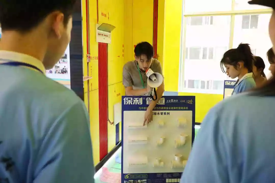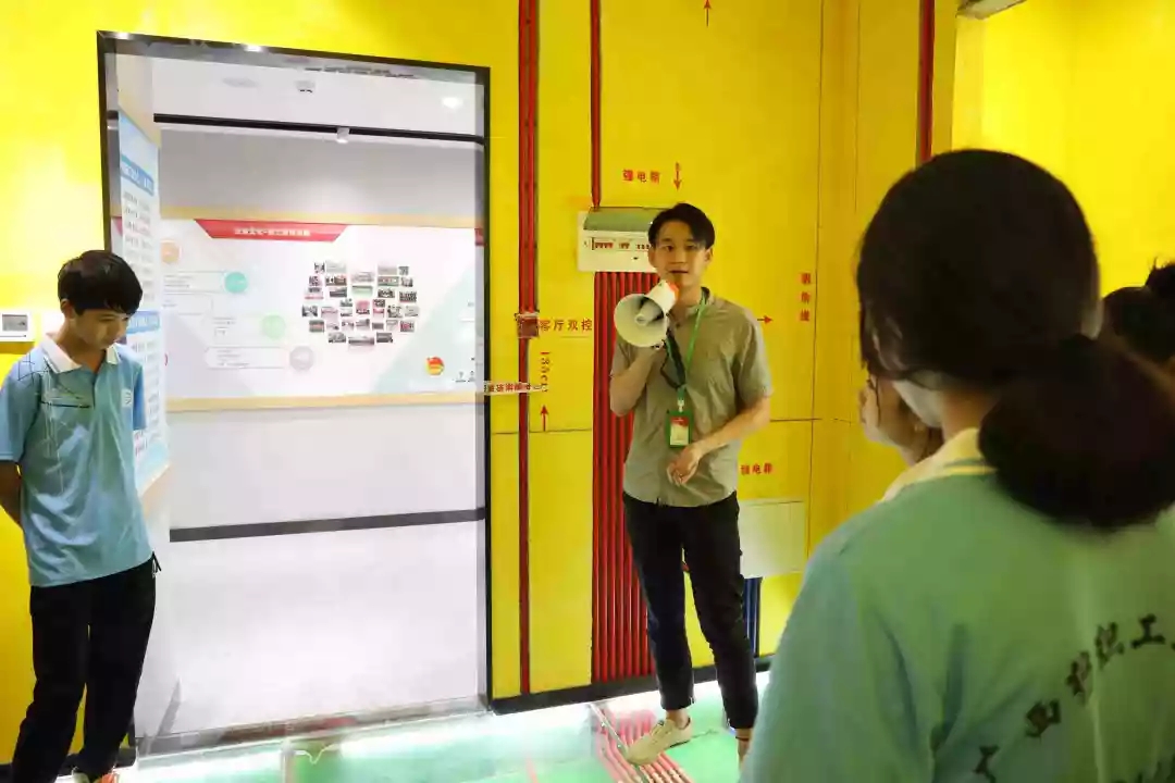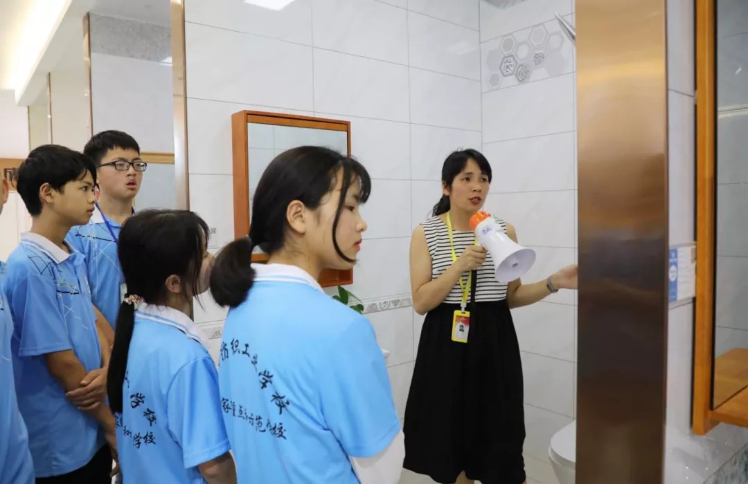 運營部設(shè)計經(jīng)理韋昌豪帶領(lǐng)學(xué)生參觀軟裝體驗館、工藝樣板間,講解裝修設(shè)計、裝修工藝、水電工程用料方面的知識,并解答學(xué)生們的疑問。