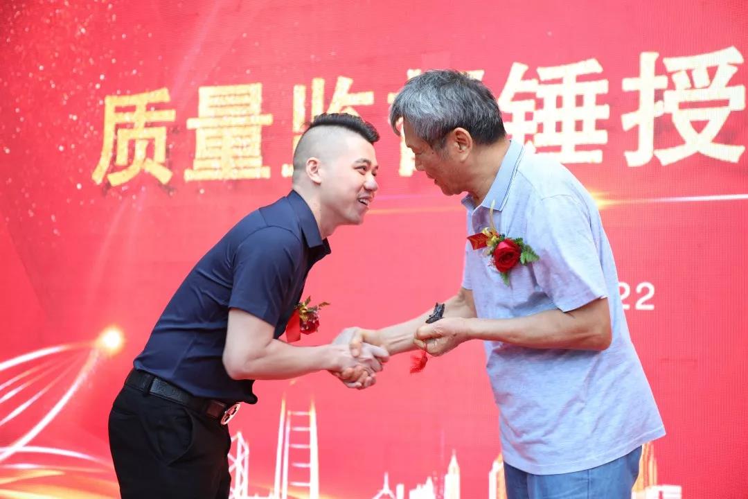 ▲集團副總裁張浩熙先生向業(yè)主代表授予質量監(jiān)督錘,并講解質量監(jiān)督錘的運用方法。