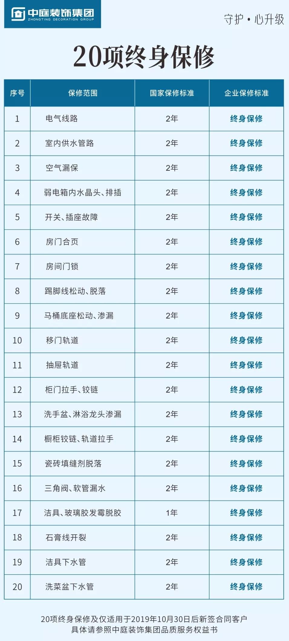 中庭裝飾集團(tuán)20項終身保修上線,按照國家有關(guān)規(guī)定,保修標(biāo)準(zhǔn)為兩年的20項家裝工程,我們承諾終身保修!