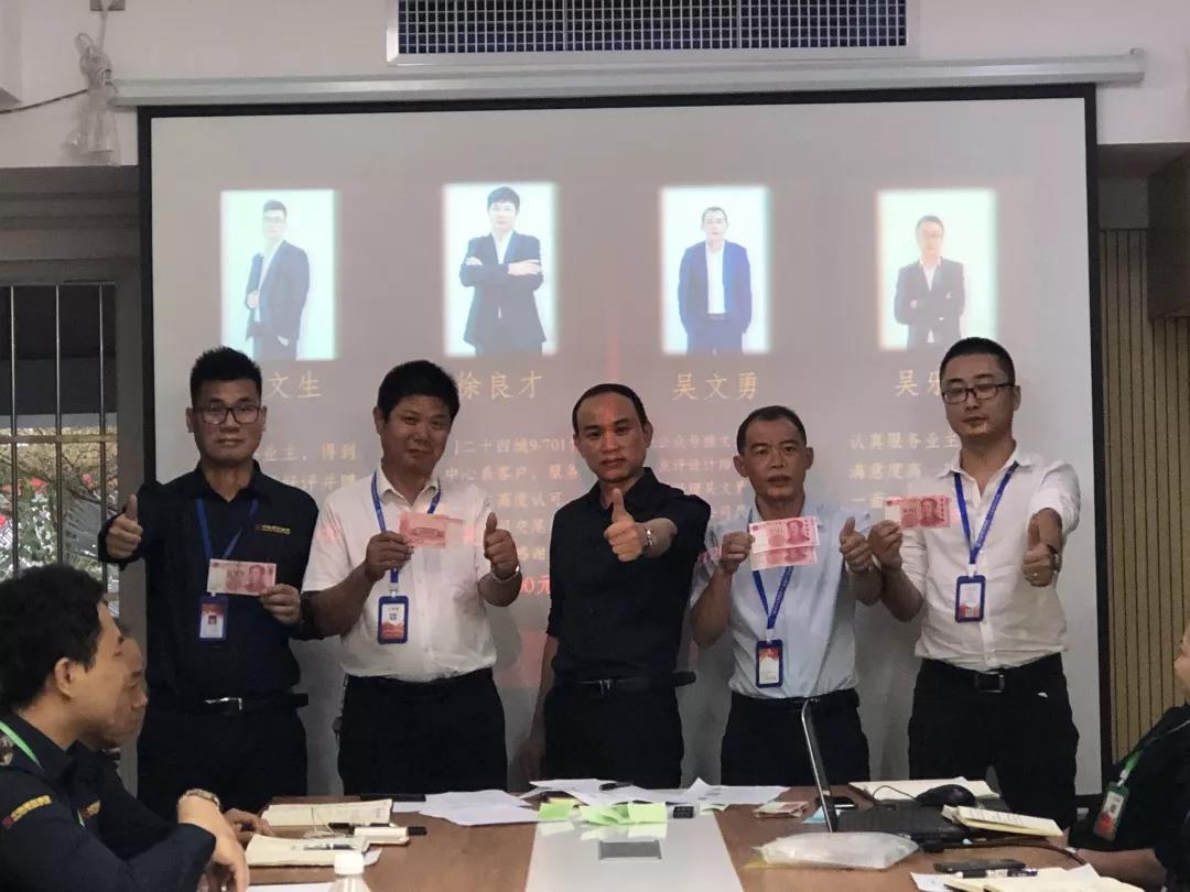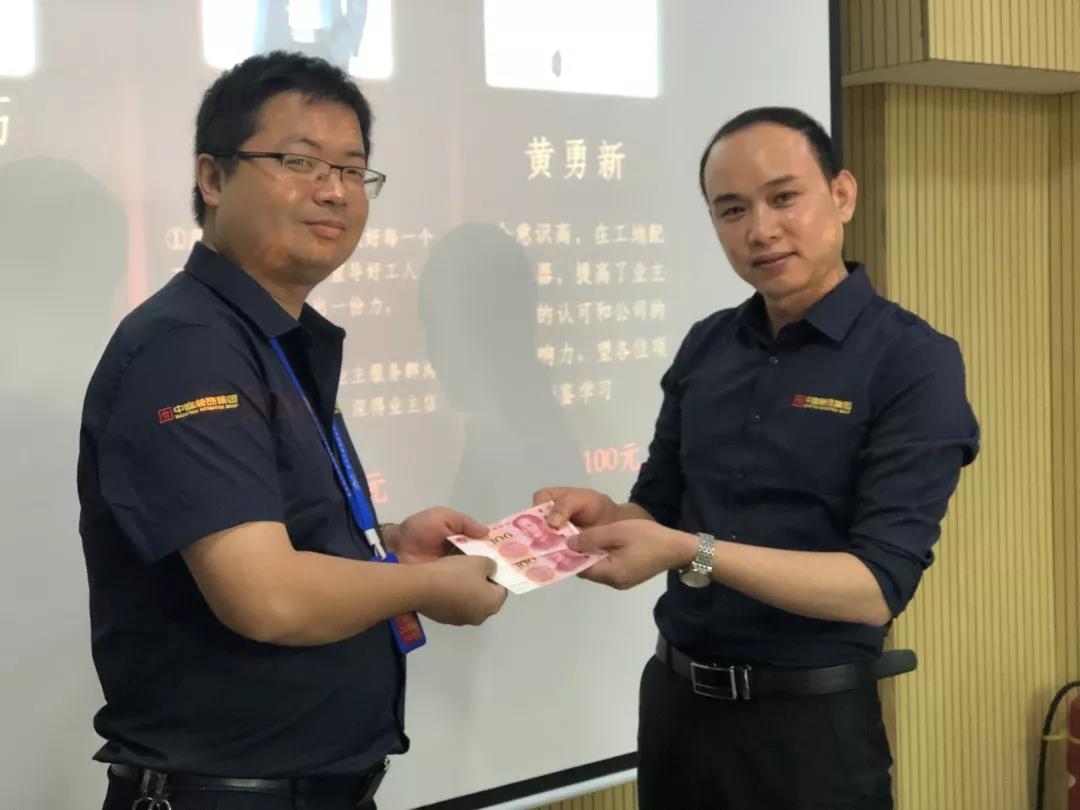 吳總(右一)為項目經(jīng)理殷傳高頒發(fā)月度獎金