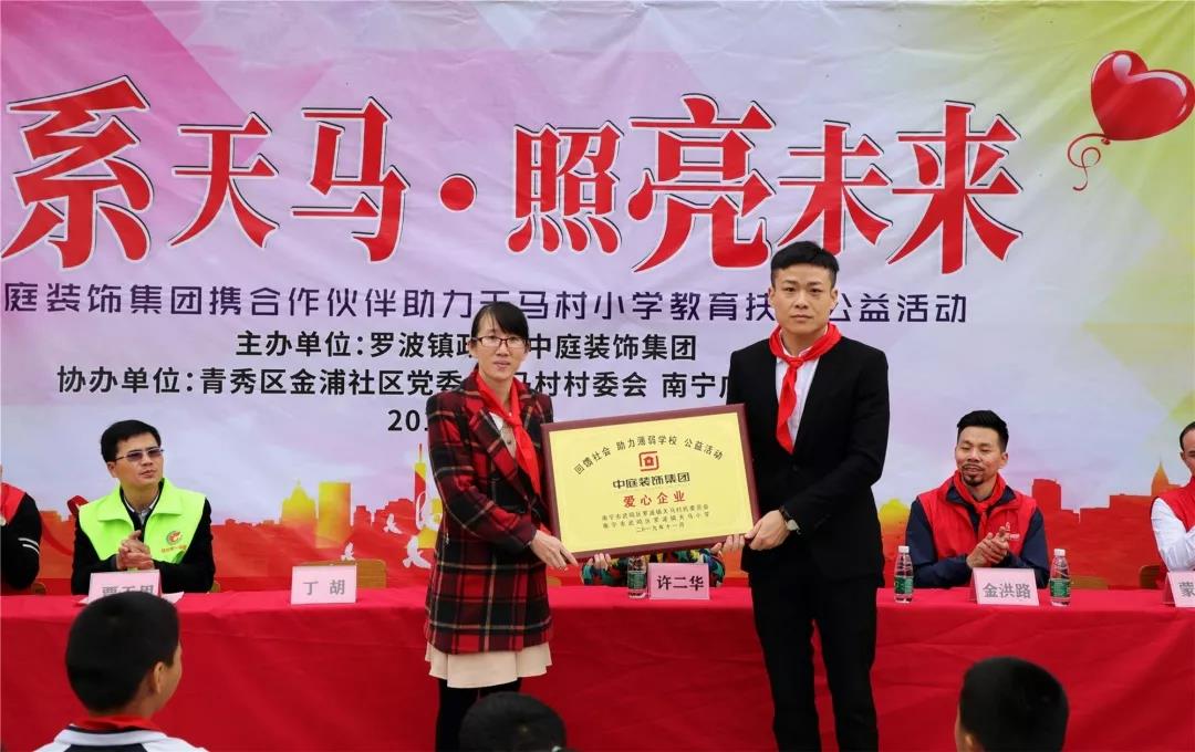 ▲副鎮(zhèn)長吳潔代表羅波鎮(zhèn)政府授予中庭裝飾集團(tuán)愛心企業(yè)榮譽(yù)牌匾,感謝中庭對羅波鎮(zhèn)薄弱小學(xué)的愛心善舉。