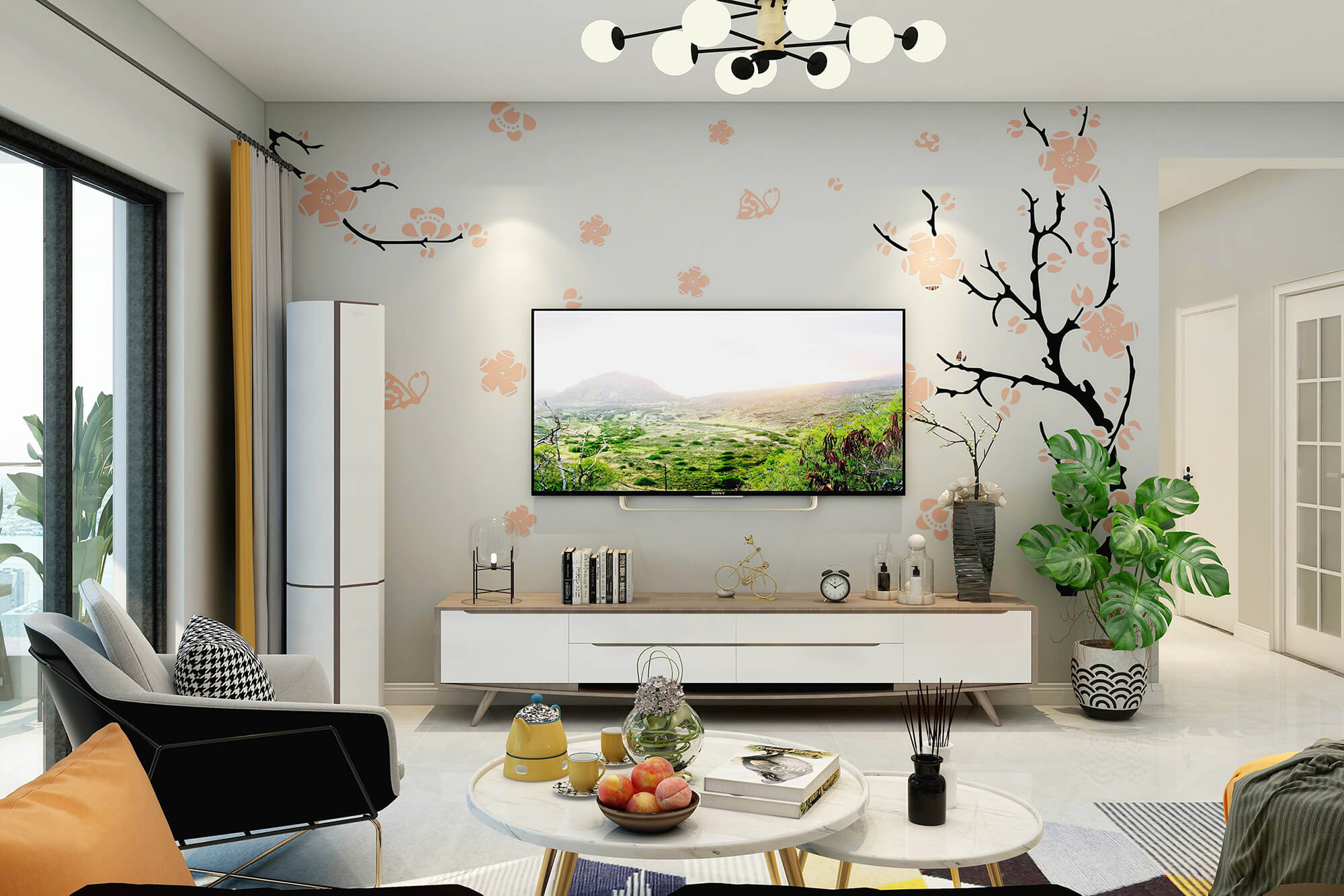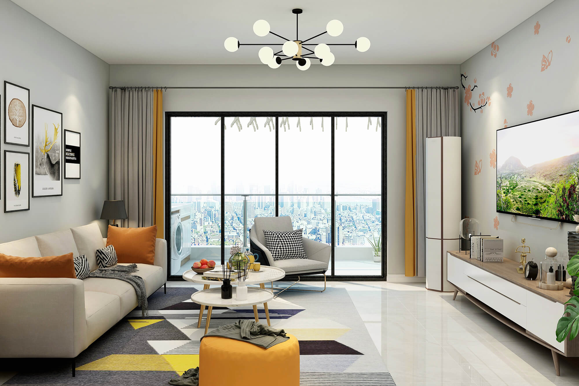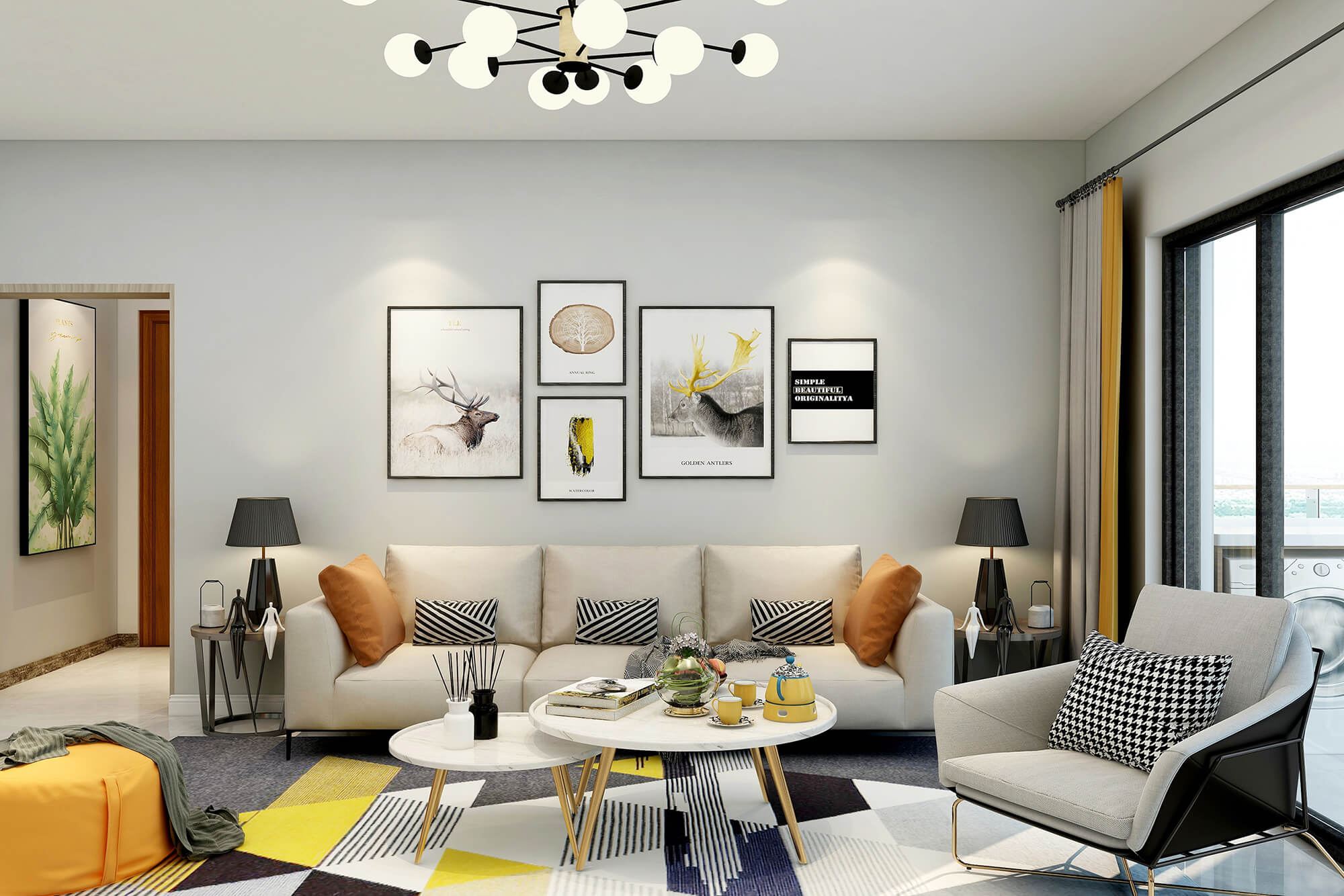 白色與米白色的搭配看起來干凈又溫柔,加上地毯里一抹明黃的顏色與沙發(fā)的橙色抱枕和橙色圓凳的跳色讓溫柔的搭配里又多了絲活潑,加上綠植點(diǎn)綴更好的融合了整體空間的色彩搭配。