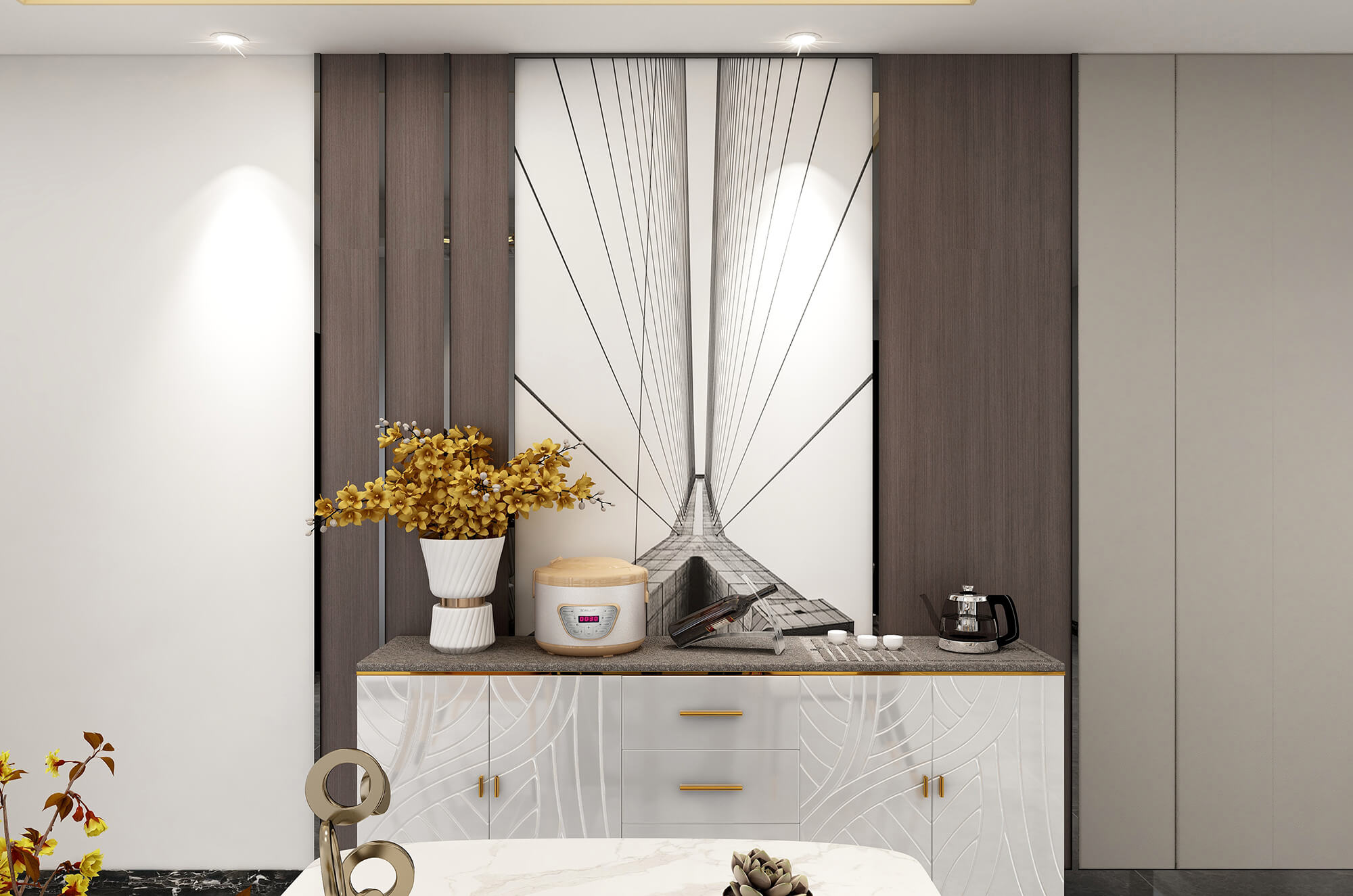瀏覽量:558本案整體空間設計時尚大氣、舒適宜居。以淺灰為主色調(diào),在空間與家具中巧妙的糅合了金屬元素,營造出時尚前衛(wèi)的家居氛圍,適當?shù)牟AР馁|(zhì)、亮色作為點綴,增添精致質(zhì)感,形成了獨具特色的現(xiàn)代簡約輕奢風格。