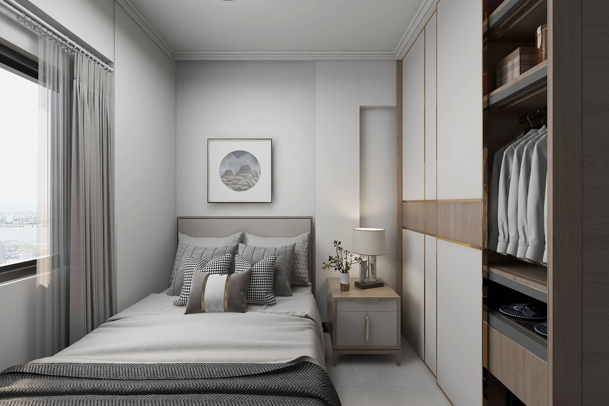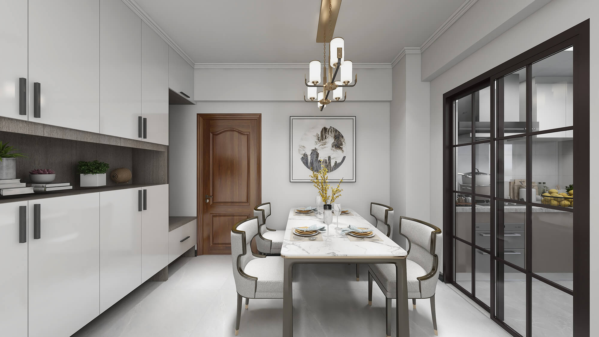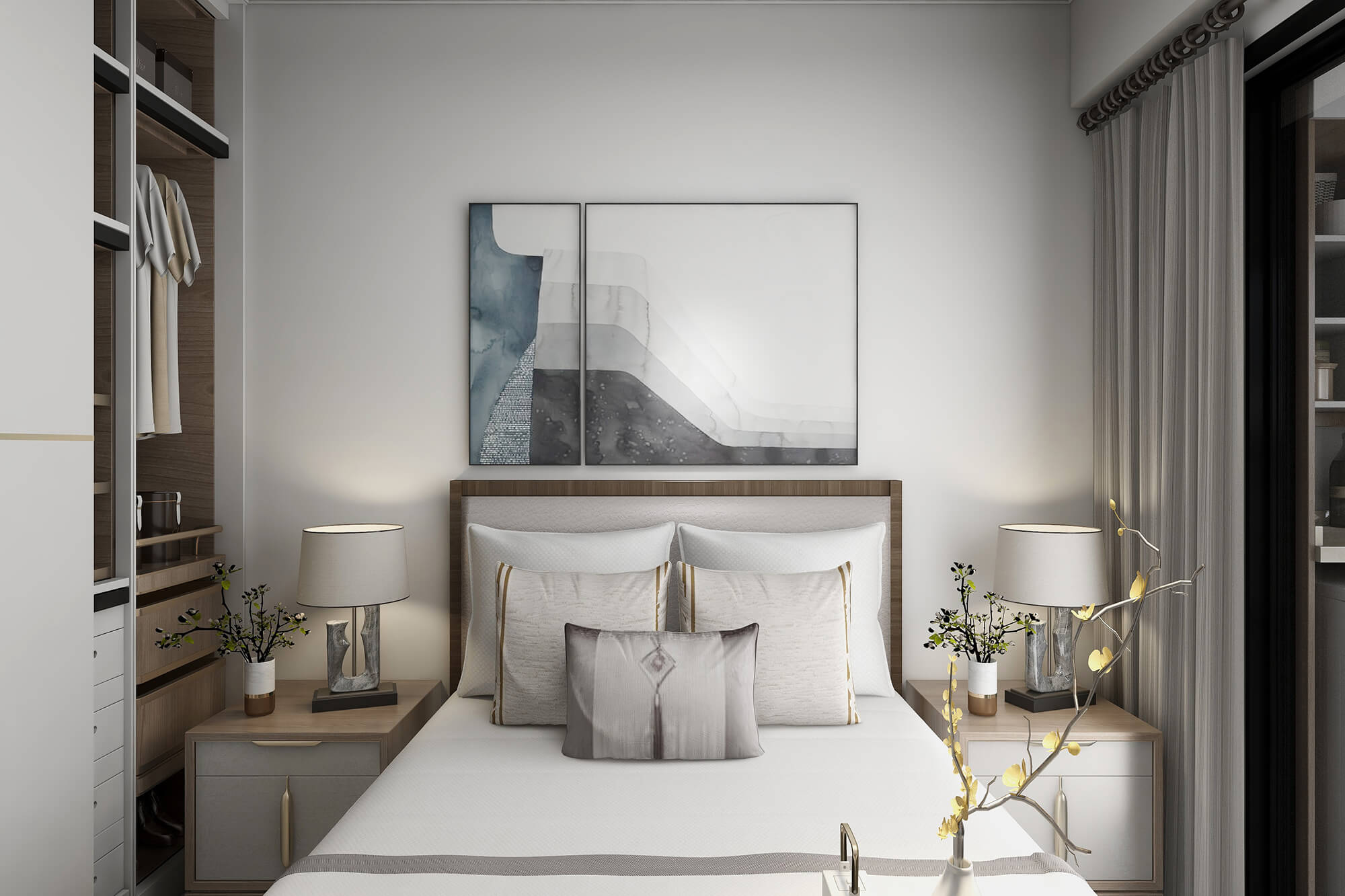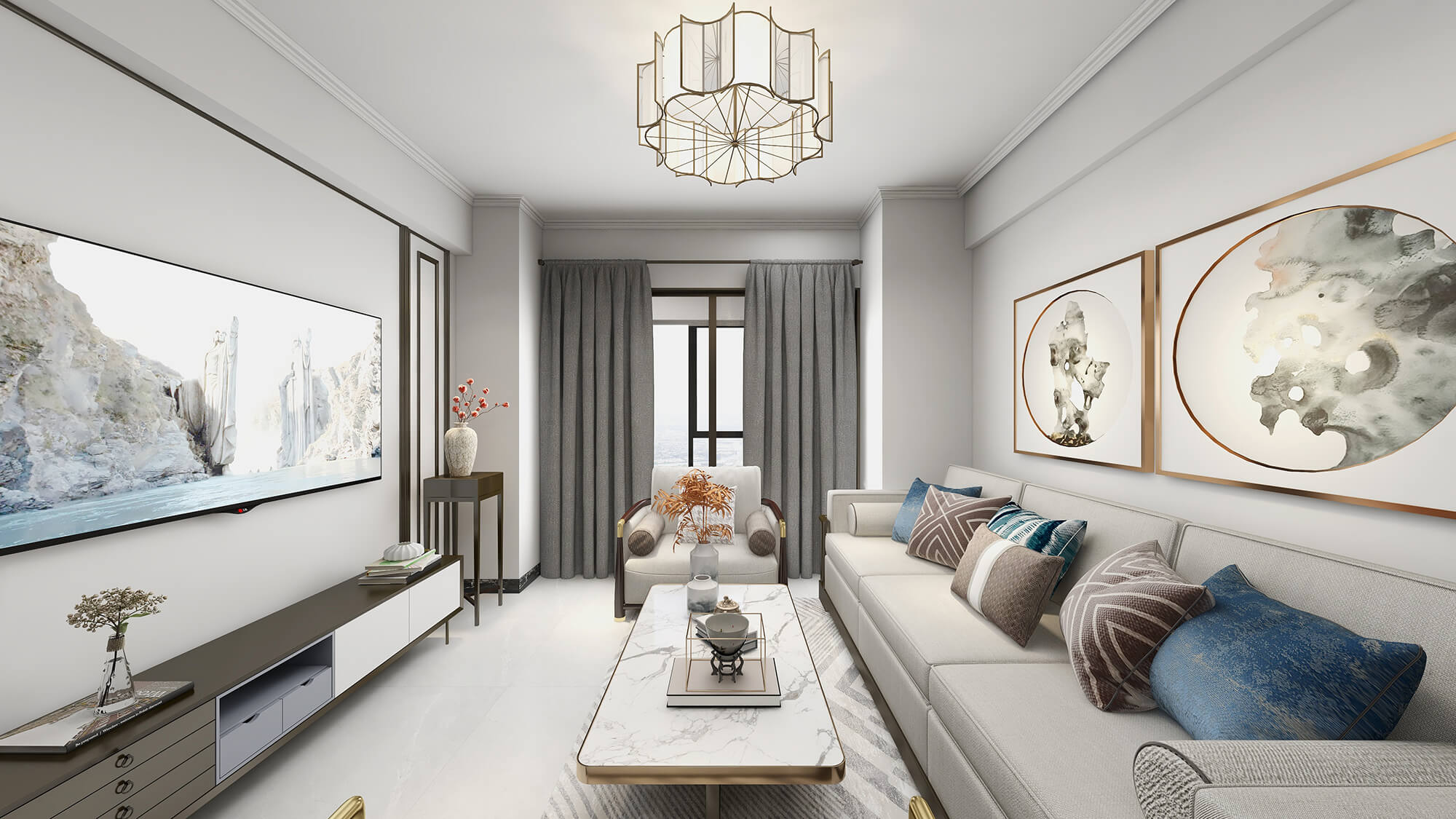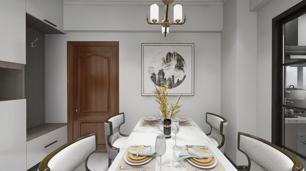 本案戶型為:3房2廳2衛(wèi),總面積72㎡。本案風(fēng)格為新中式,在空間中以淺灰色為主色調(diào),將中式元素以生活的面目表達(dá)出來。在造型、擺件等上面采用一些中式手法,為空間增添高雅秀逸的意境美,使得整體空間賞心悅目,并充滿韻味。