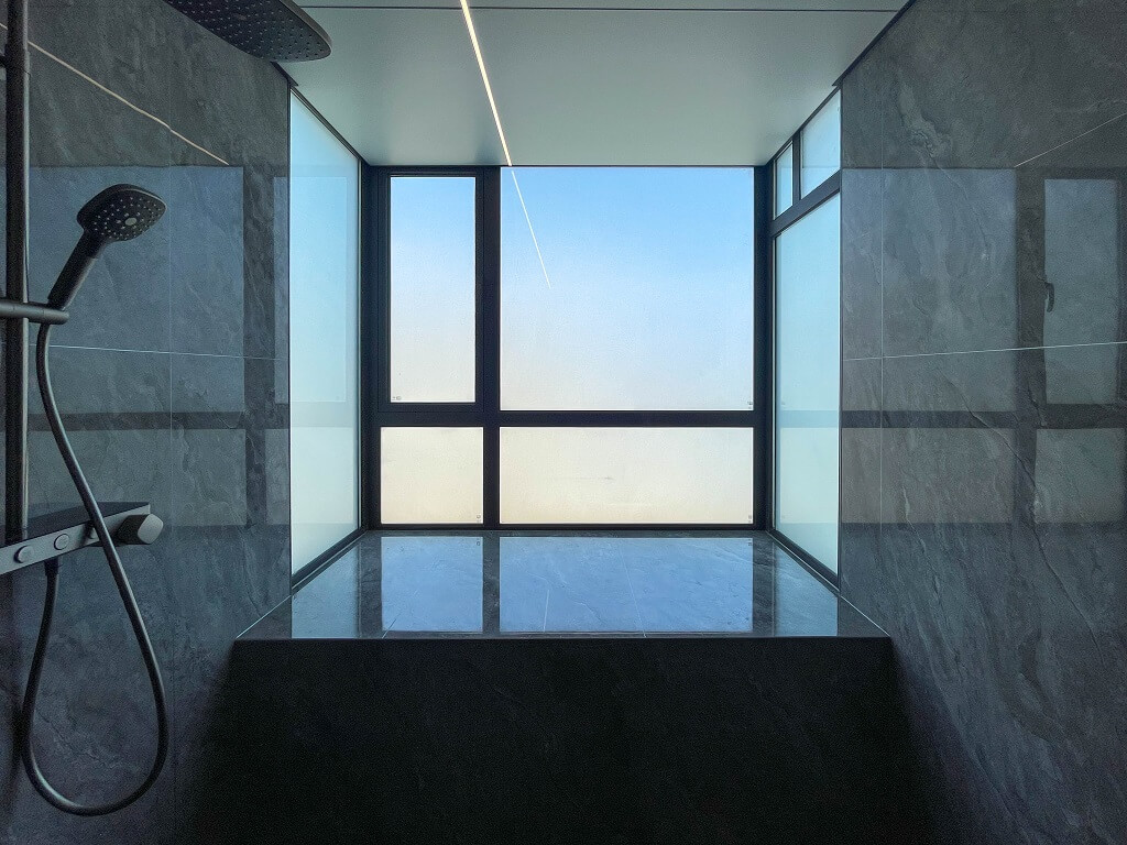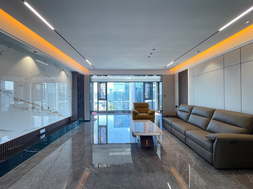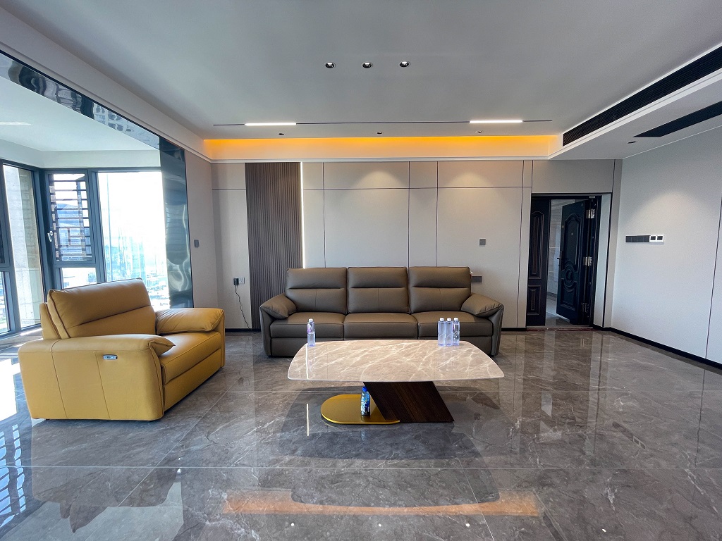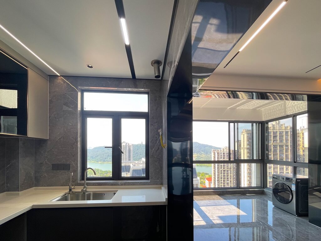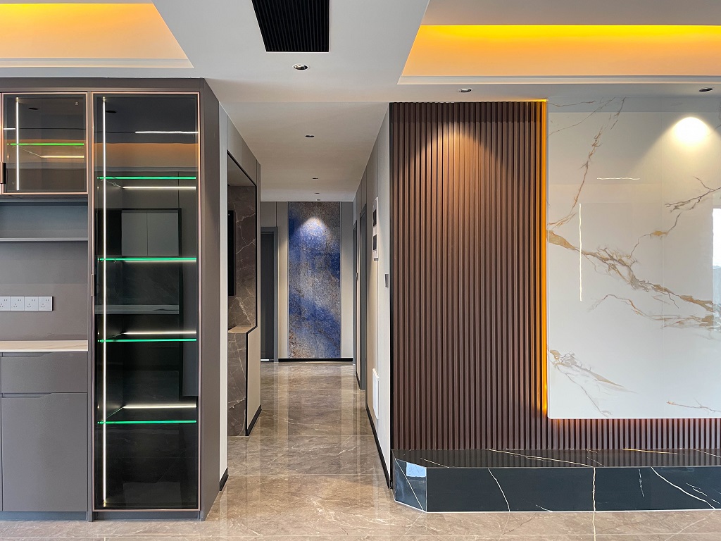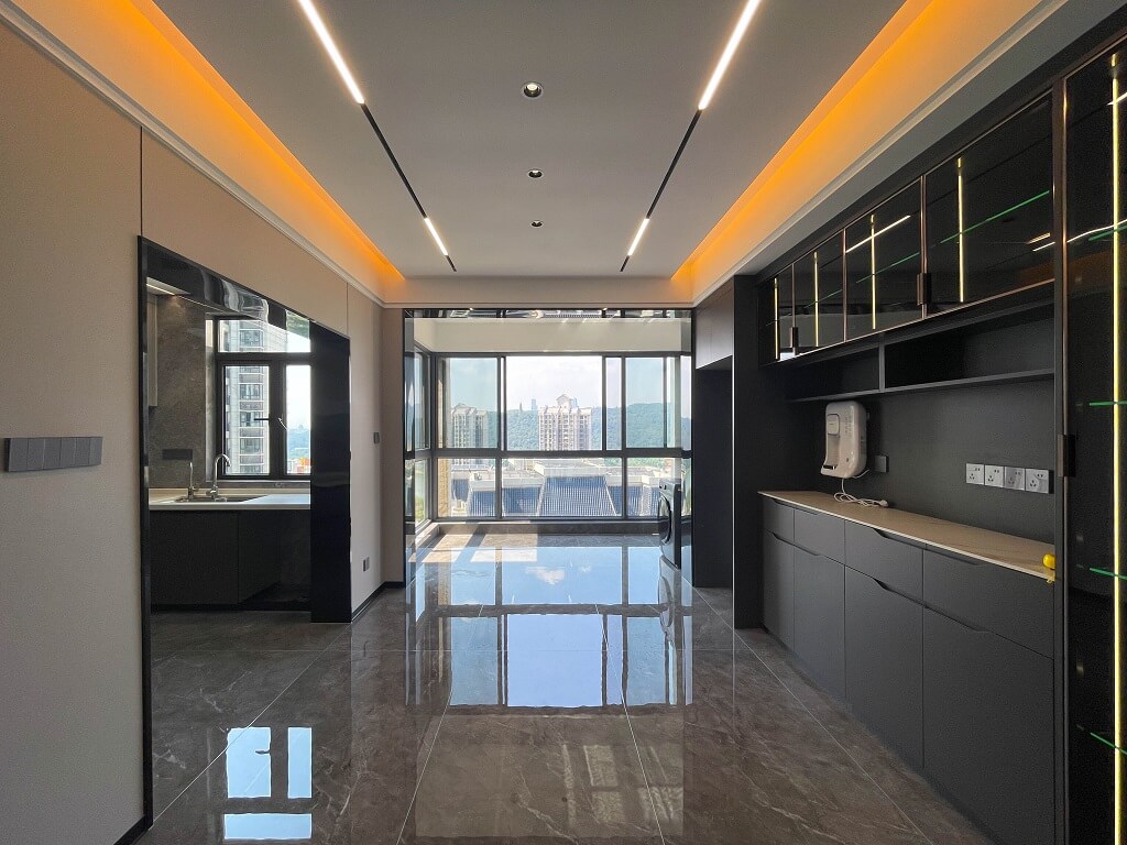 整屋采用黑色亮面護墻板,與全屋通鋪的灰色瓷磚形成和諧統(tǒng)一的整體風格,無主燈的設計,通過局部照明和燈帶的巧妙運用,營造出柔和的光線氛圍。雙眼皮吊頂和兩邊吊頂疊加的設計,為空間增添一份獨特的層次感。