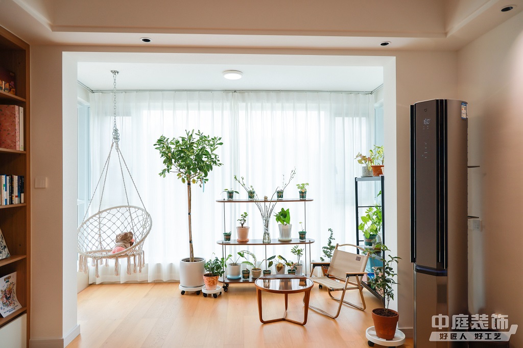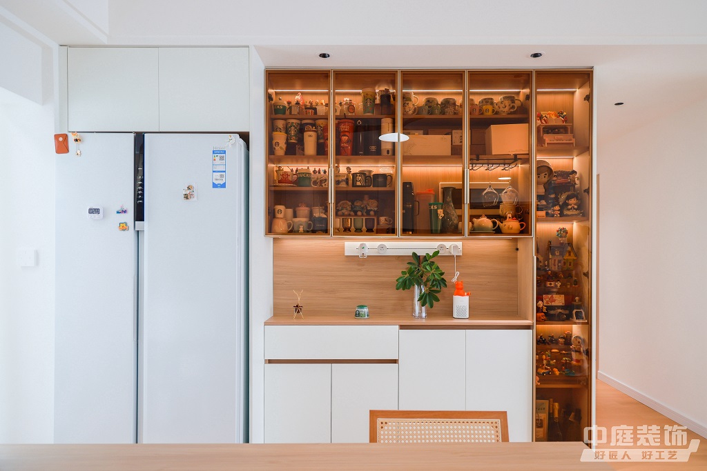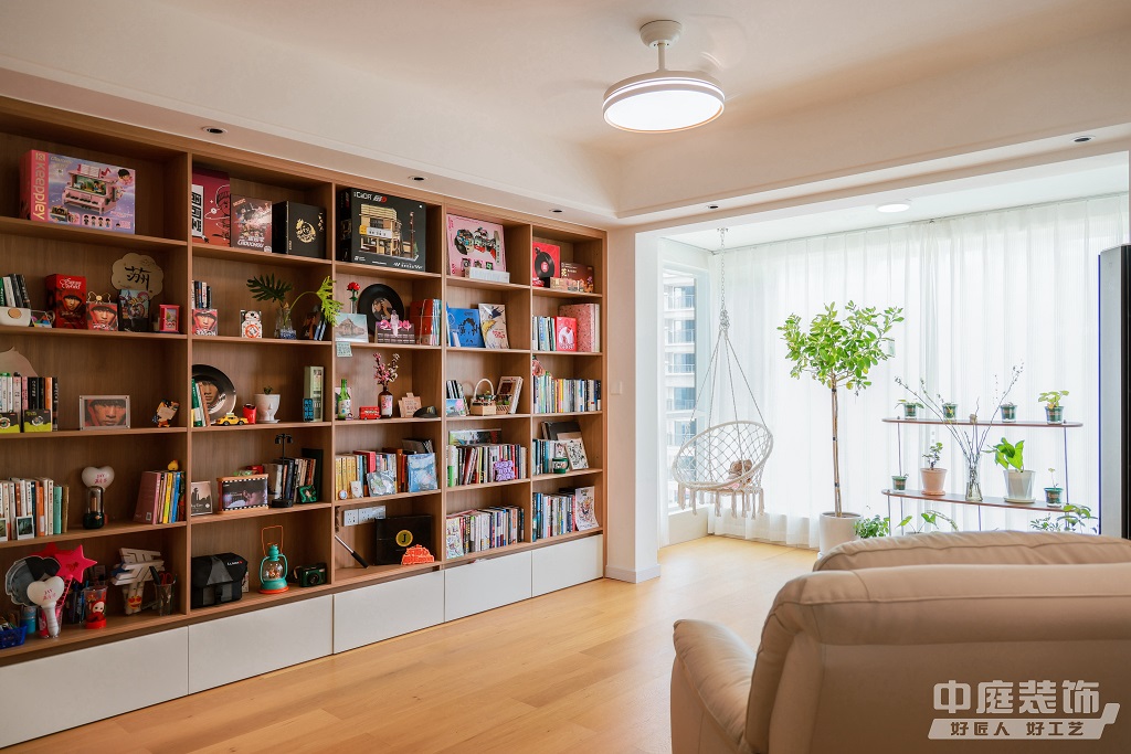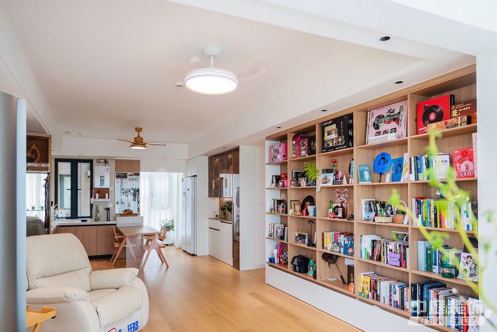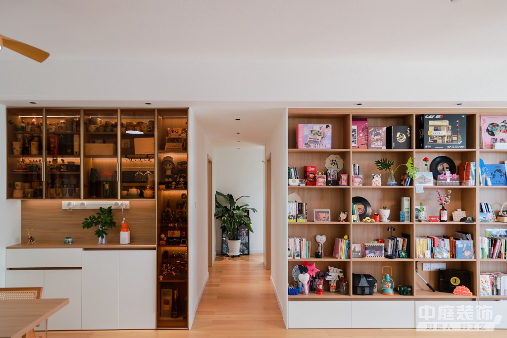 仿佛步入了一個自然與簡約交織的溫馨空間。淺色調(diào)的木質(zhì)地板營造出一種質(zhì)樸而不失高雅的氛圍??蛷d中央,去客廳化的設(shè)計,一排原木色到頂書架擺滿精心挑選的物件和書籍,一進門就能感受家的溫暖。