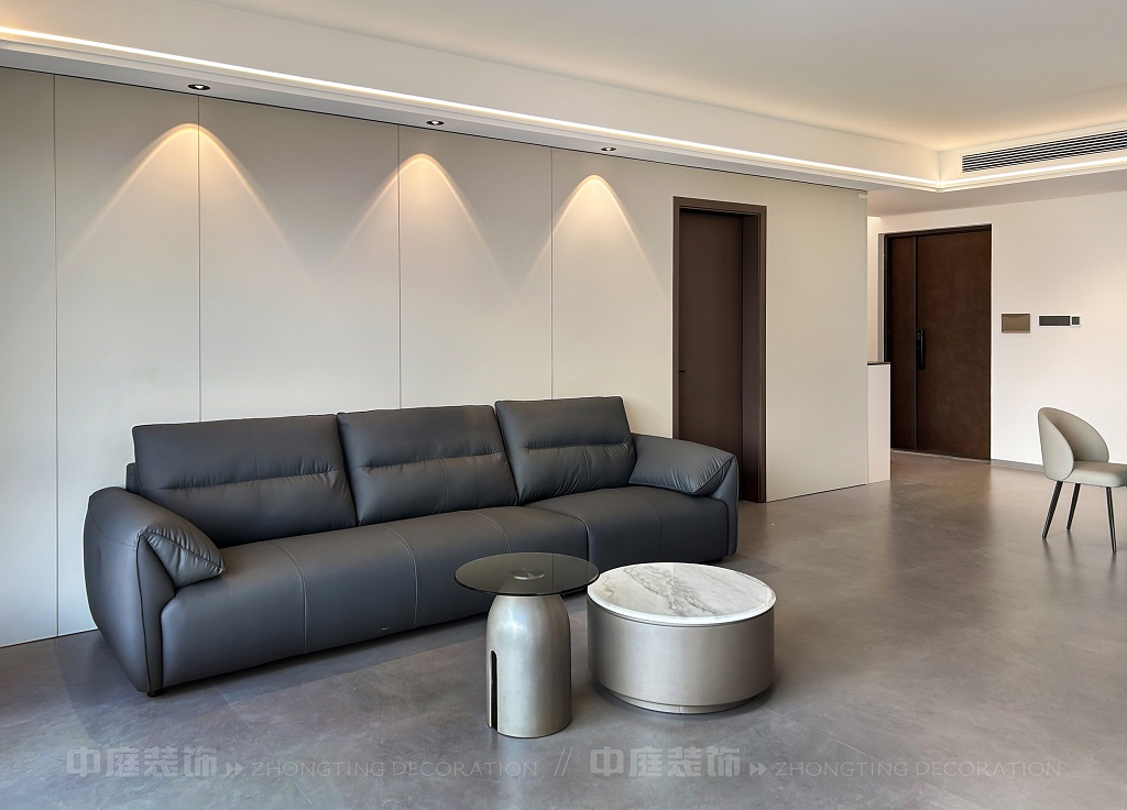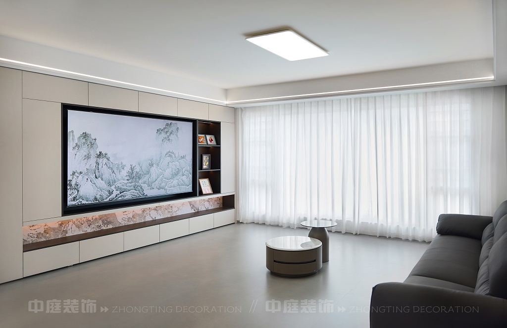 客廳電視背景墻的山水畫面,既具現(xiàn)代設(shè)計(jì)的視覺沖擊力,又蘊(yùn)含傳統(tǒng)山水意境。材質(zhì)上選用簡約的板材、大理石與金屬元素,搭配簡潔的家具造型,呈現(xiàn)出低調(diào)的奢華感。燈光設(shè)計(jì)以線性燈和嵌入式燈具為主,通過柔和的光影強(qiáng)化空間層次。同時(shí),在簡約的布局中融入對生活細(xì)節(jié)的考量,讓整個(gè)空間既符合現(xiàn)代都市人的審美需求,又傳遞出含蓄的東方美學(xué)意境,實(shí)現(xiàn)了功能性與藝術(shù)性的平衡,打造出舒適且富有格調(diào)的居住環(huán)境。