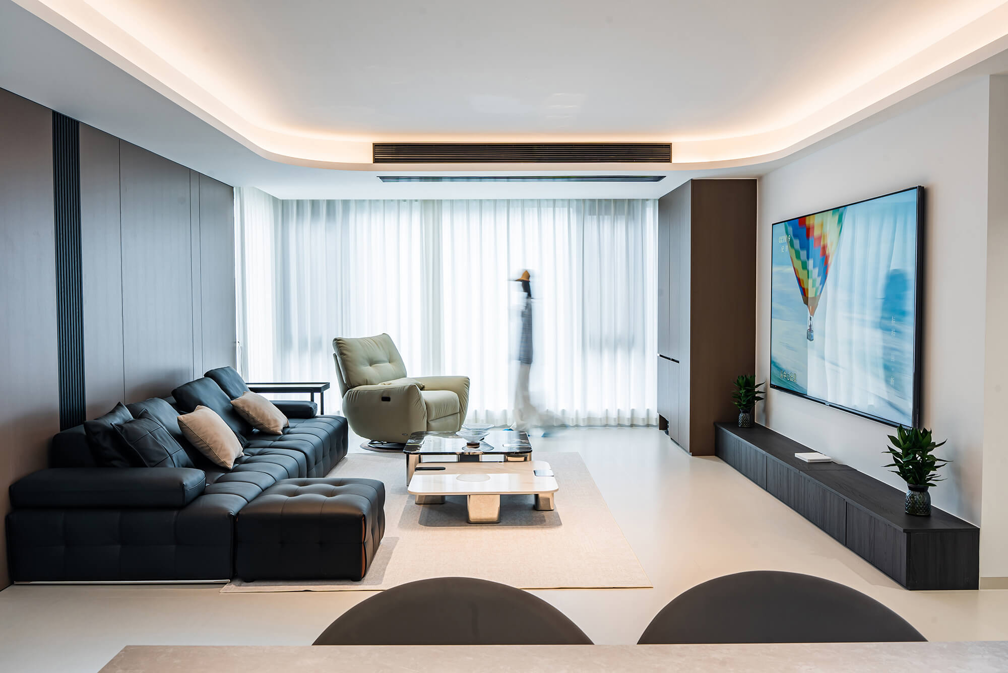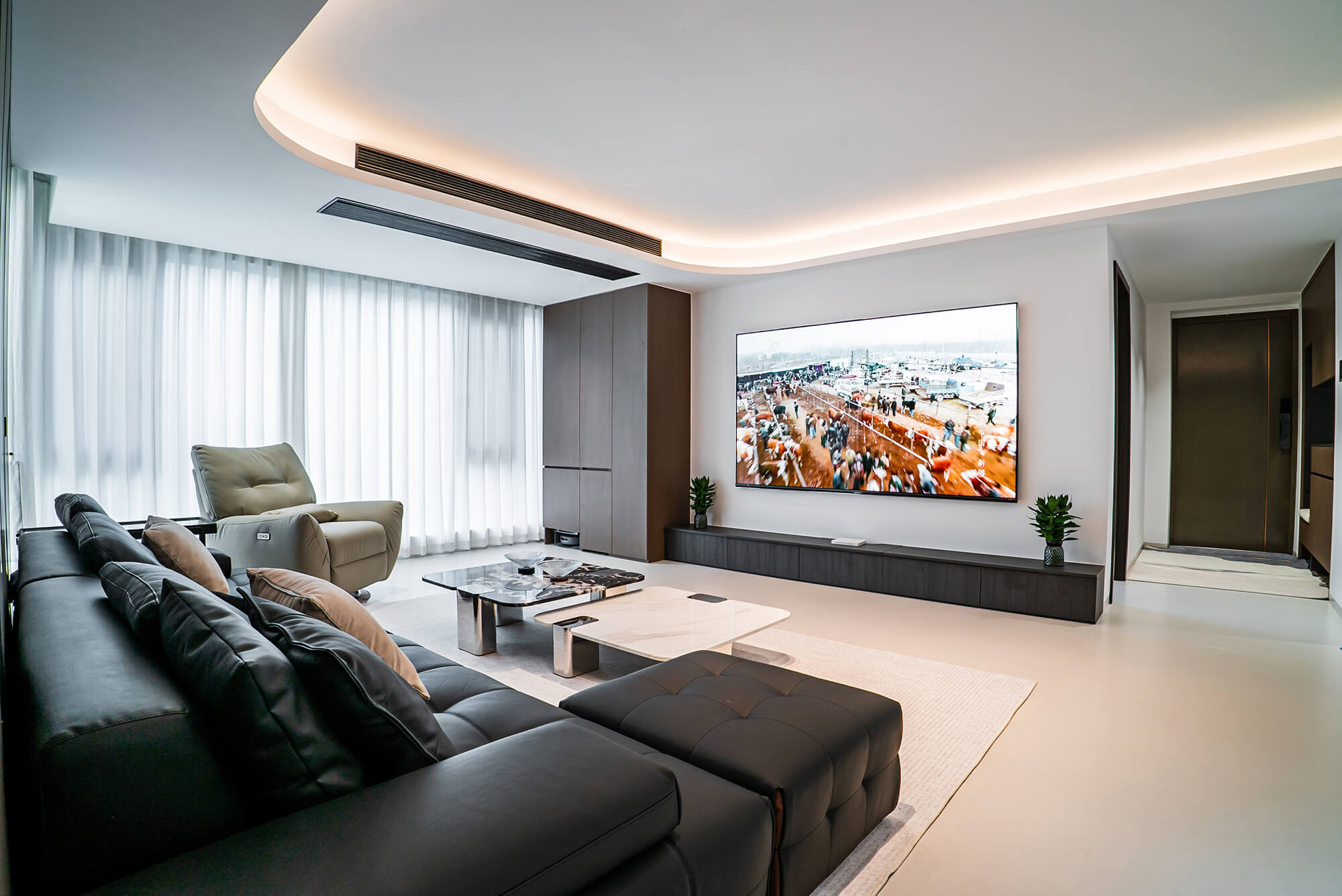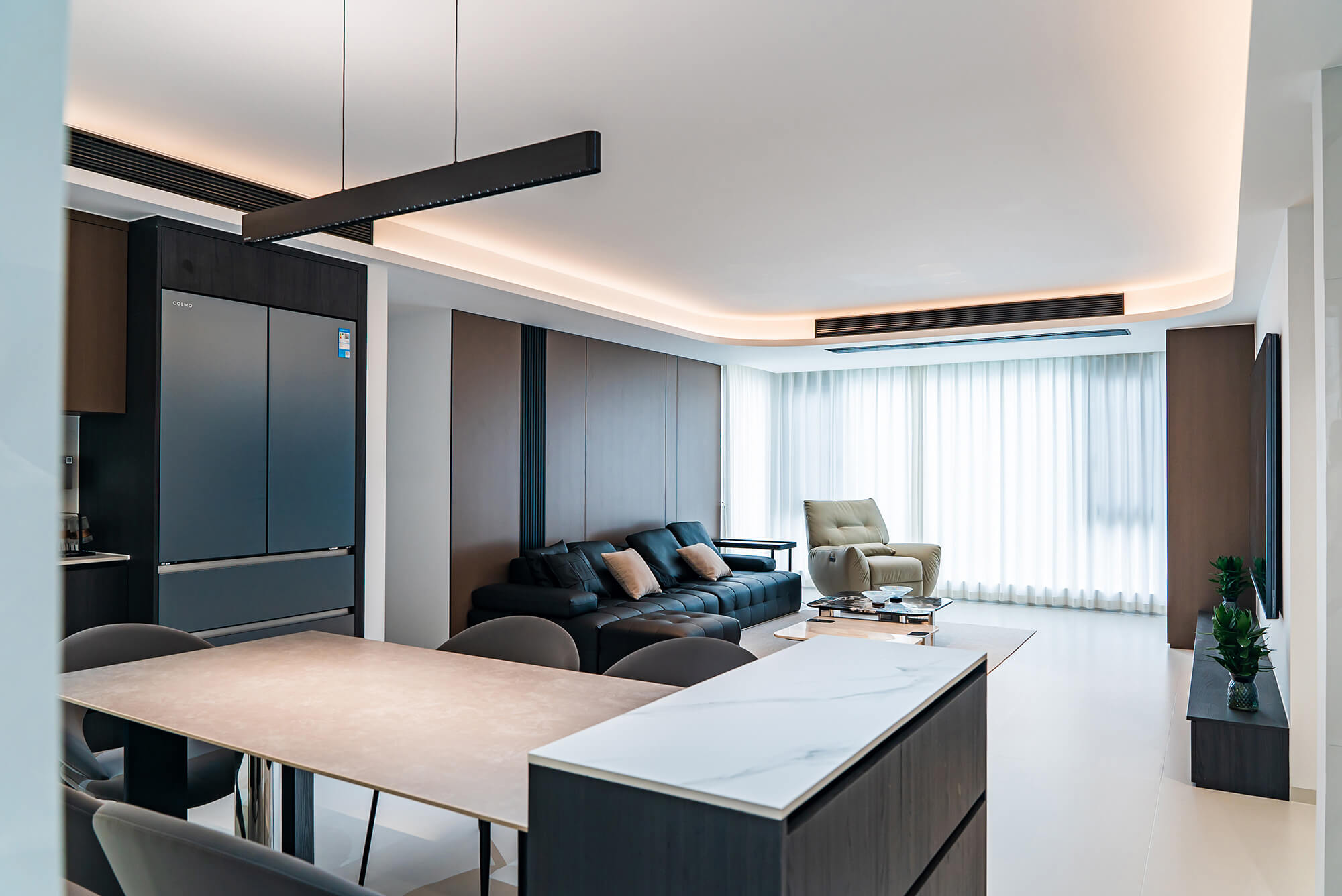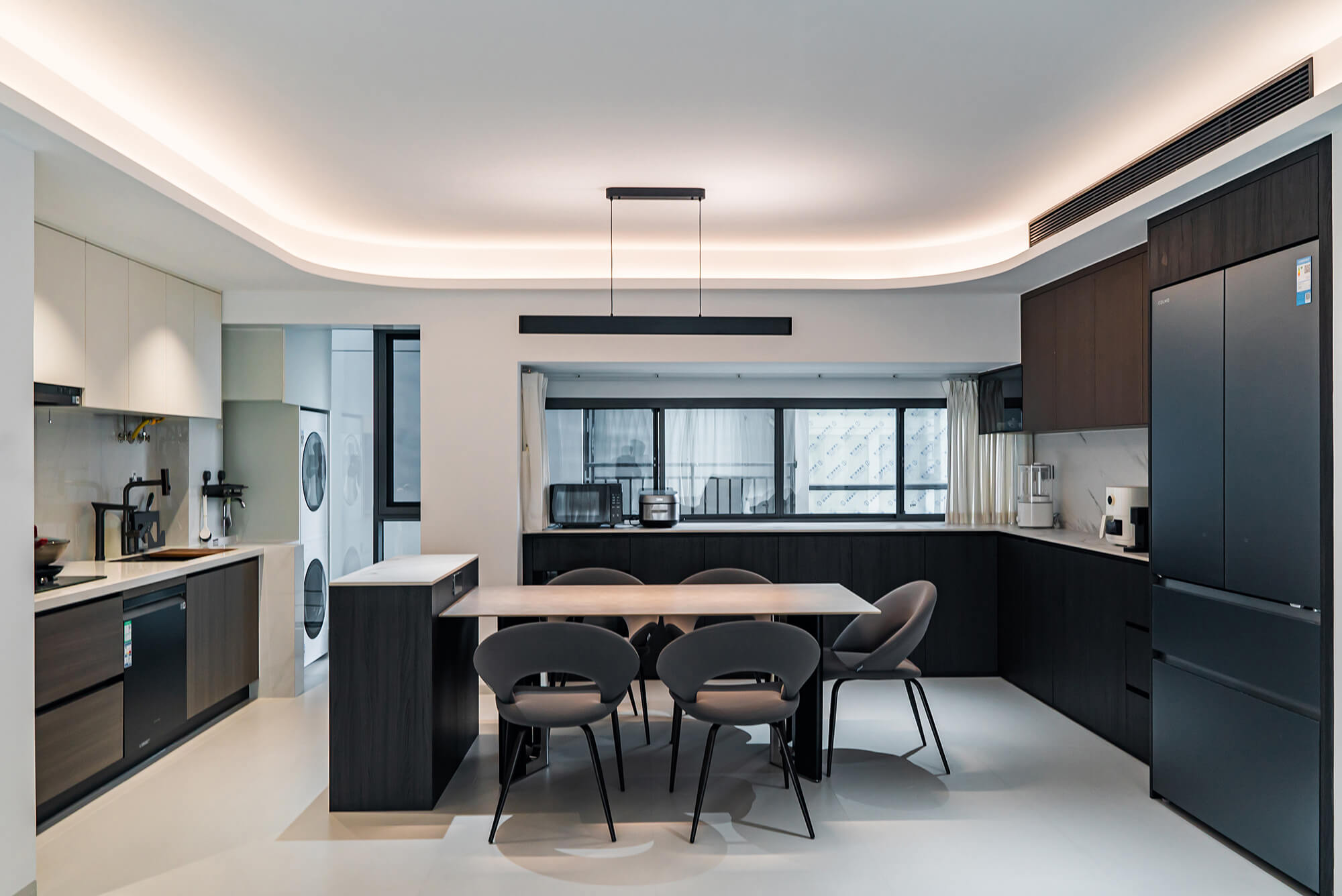 極致純粹的色彩美學(xué),以黑、白、灰三個(gè)基礎(chǔ)色構(gòu)建空間骨架,通過不同明度、材質(zhì)的層次對(duì)比(如啞光水泥、亮面巖板、磨砂金屬)豐富視覺。線條利落干脆,無多余裝飾,注重功能與結(jié)構(gòu)的統(tǒng)一性,打造冷靜、理性、富有高級(jí)質(zhì)感的極簡空間。