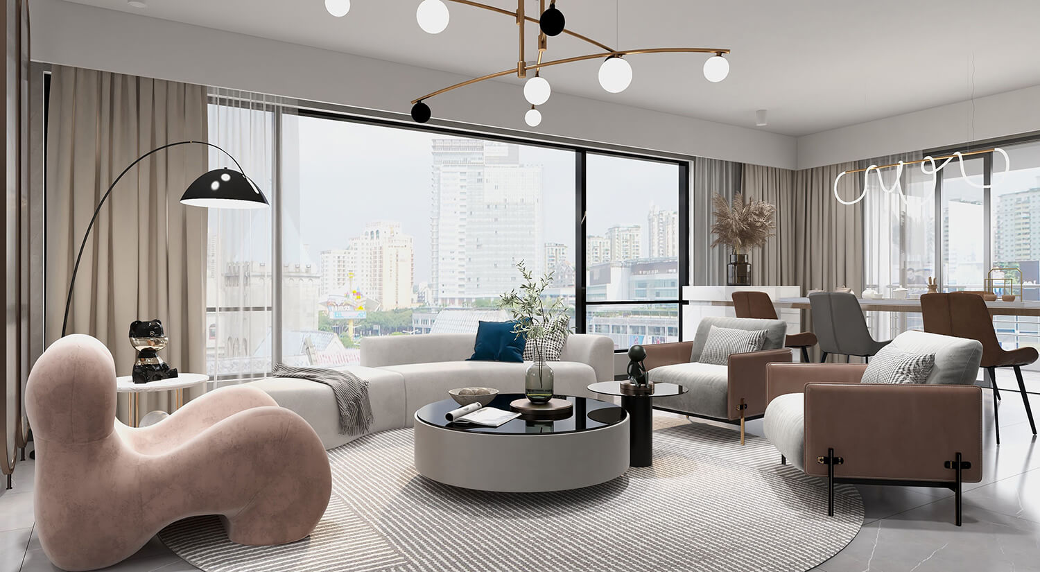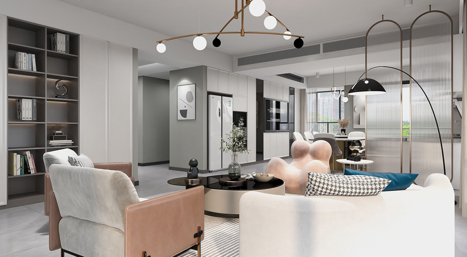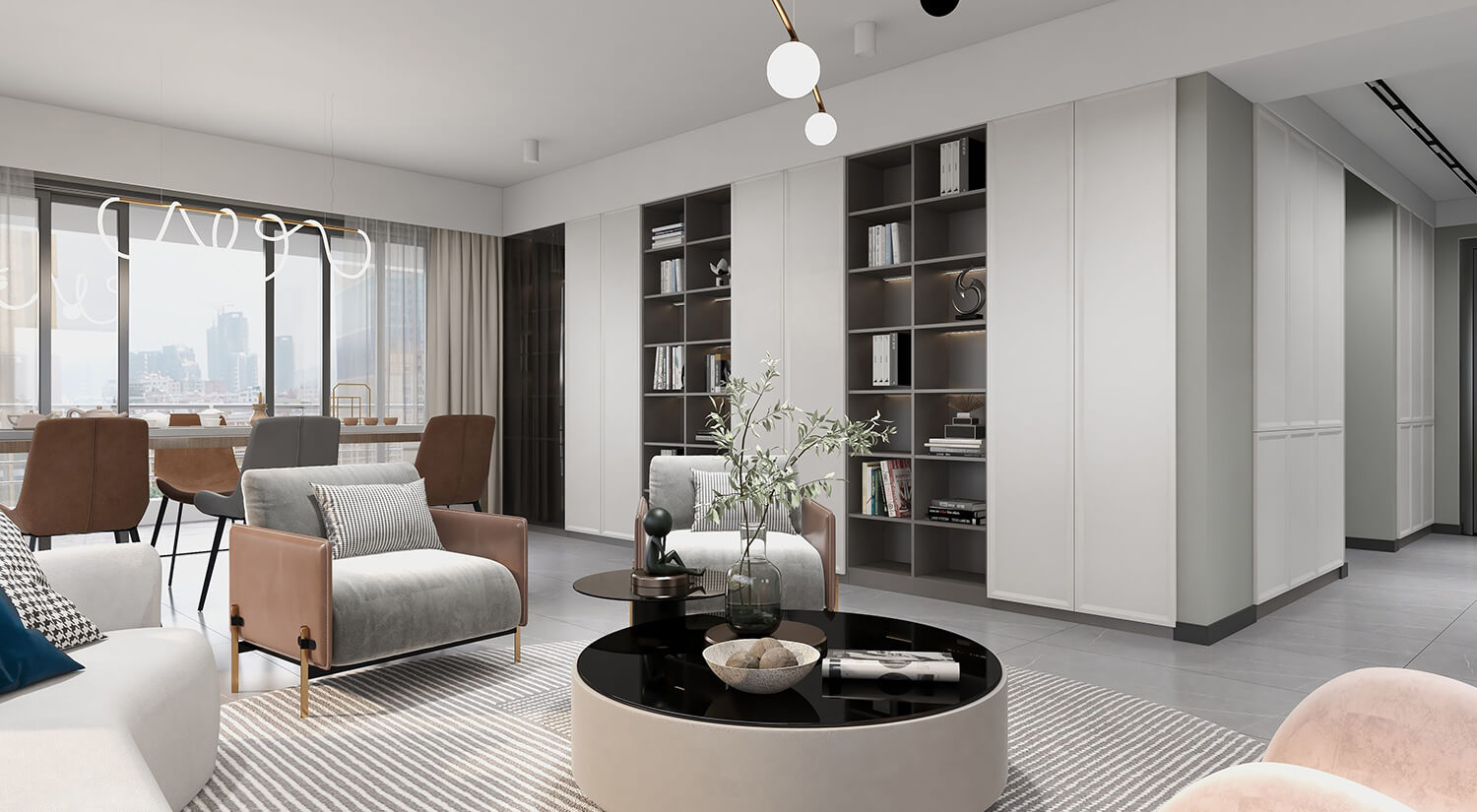 本案例戶型為:3房1廳1衛(wèi),總面積130㎡。整體家具通常采用簡約的線條和材料。家具的色調以灰色、米色、白色為主,這些顏色可以營造出一個舒適和溫馨的氛圍。
