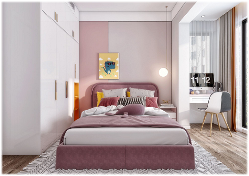 公主房主體以粉色輔以大面積留白,主體粉色吸引目光美麗溫馨,而充滿樂趣,大面積白色代表純潔,充分表現(xiàn)了少女的甜蜜純潔,在此之中輔以橙色在美麗中又不缺活潑,一點(diǎn)點(diǎn)灰色豐富整個畫面感帶有端莊,房間陽臺外擴(kuò),充分利用空間開闊明亮。