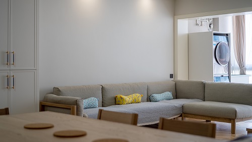 3.廚房:開放式廚房與客廳互為連通又相對獨立,中西廚合并與島臺的設計滿足烹飪需求。